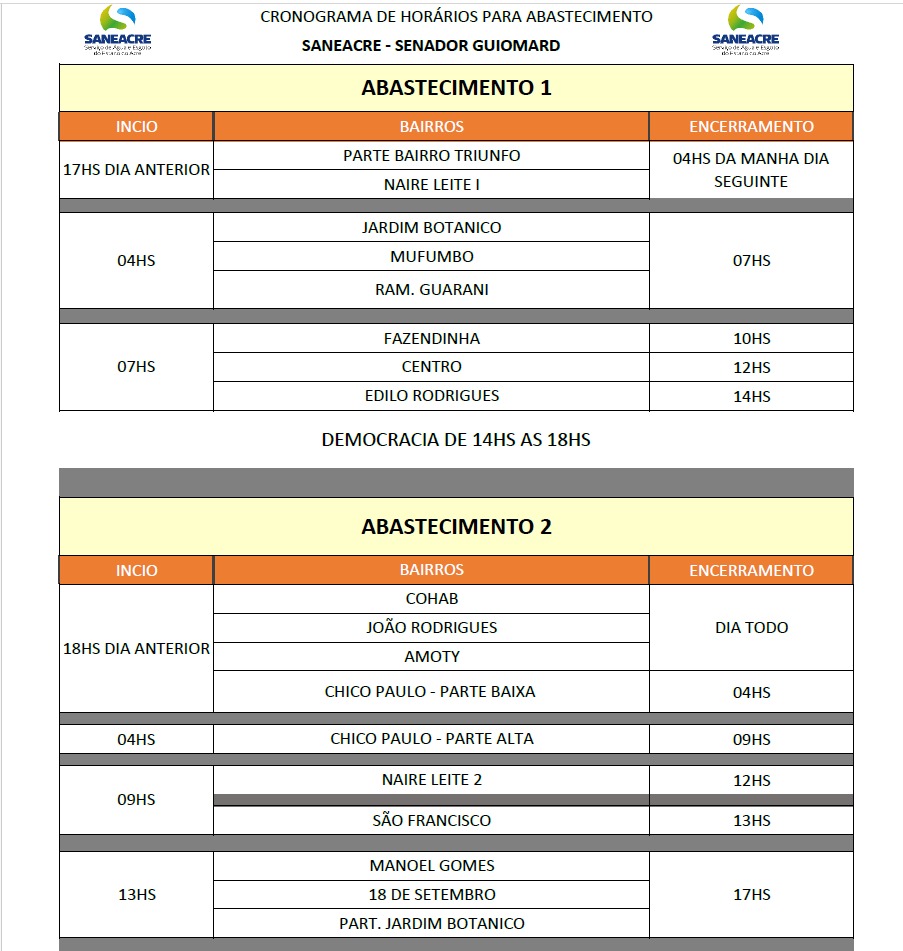 O Serviço de Água e Esgoto do Acre (Saneacre) informa à população de Senador Guiomard que um novo cronograma de abastecimento foi definido nesta semana para garantir mais eficiência na distribuição de água em todas as regiões do município.
